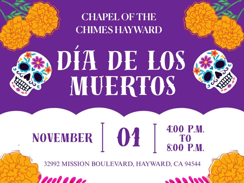 Join us on Saturday, November 1, from 4:00 PM to 8:00 PM for an unforgettable evening of music, culture, and tradition as we celebrate Día de los Muertos at Chapel of the Chimes Hayward.